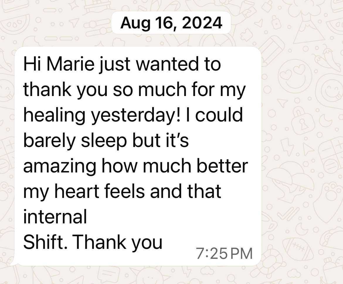 “I had an energy reading done by Marie, and it was the first time I experienced any type of energy healing. I found it extremely helpful in understand my personal chakra system better, her thoughtful and thorough explanations helped me make some very beneficial healing breakthroughs. I highly recommend anyone who is interested in becoming the best version of themselves to give this high quality energy reading a try, you will be surprised and grateful at the accuracy and at Marie's genuine desire to help. I will definitely book again with her in the future!”